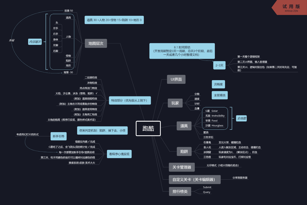 跑酷我们参考了传统的跑酷玩法,有天天酷跑 、Super Mario Run 等各种横板闯关类型的跑酷游戏。最终确定下来核心玩法是,二段跳跃+冲刺 。核心玩法定下来以后,就马上开工,程序这边是由我来设计了一下开发文档,大概导图如下:
